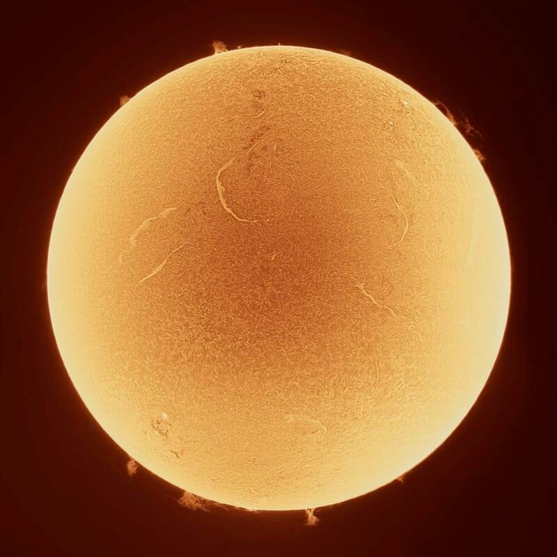 Overzicht opname V=44X als we goed kijken zie je op de foto wat zwarte strepen lopen. Dat zijn de zogenoemde ''solarflares''. Detail opname V= 100X. Beide opnames zijn gemaakt met onze Coronado zonnetelescoop!