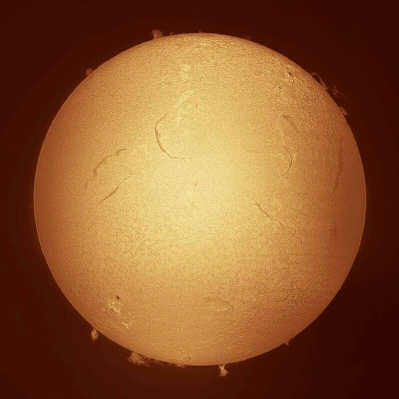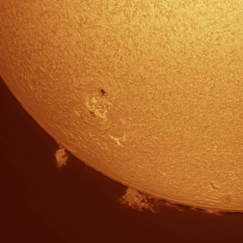 Het weer zat eens goed mee, en meteen van gebruik gemaakt om dit tafereel aan de zonsrand vast te leggen! Overzichtsfoto en gedeeltelijke uitvergroting hiervan zijn geschoten rond 12:00u bij een V= 44X, en de detailopname bij een V= 100X. De lucht was zo rustig dat er een weelde aan details te zien was... De fijnste uitbarstingen werden zichtbaar, niet alleen fotografisch, maar ook visueel met de 40mm F10 PST. Datum: 18-04-2016.