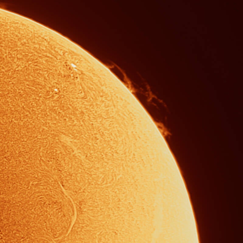 Op 20 oktober 2017 hebben wij ergens in de middag dit fraaie plaatje weten te schieten door het oculair achter onze 40mm PST zonnetelescoop. We kwamen dit vergeten plaatje in onze bestanden tegen, maar bleek meer dan de moeite waard om hem alsnog te plaatsen! Zo blijkt maar weer eens dat de bij tijd en wijlen de zon zeer actief kan zijn; de Aarde zal hier met gemak meerdere keren in kunnen passen! Op de foto zijn heel mooi de boogvormige structuren te zien; De magnetische lussen waarlangs het super-hete gas loopt... Echt spectaculair!