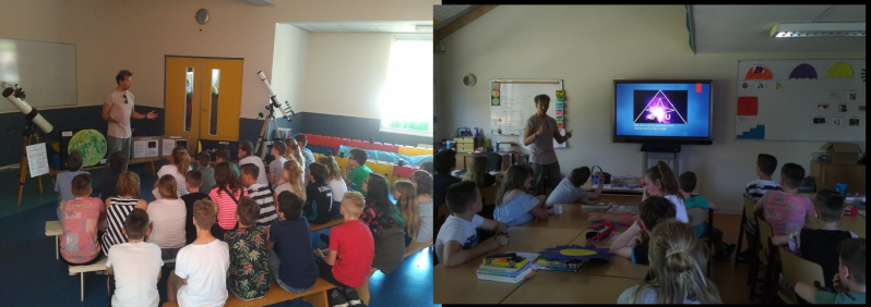 Na eerst wat verteld te hebben over de belangrijkste telescooptypen en afstanden in het heelal en in het bijzonder binnen ons zonnestelsel hadden we na de eerste vragen beantwoord te hebben al een half uur pauze. Daarna naar buiten, waarbij wij een leerkracht en een 5-tal leerlingen buiten op het schoolplein weggezet hebben om het zonnestelsel uit te beelden van Zon t/m Jupiter. Het paste maar net op het schoolplein, want we hadden de afmetingen van de Zon en planeten en hun onderliggende afstanden op dezelfde schaal! Velen waren verbaasd hoe ver dan nog alles van elkaar af stond! Als afsluiter binnen nog een voordracht over ons zonnestelsel waarbij we wel duidelijk maakten hoe je veilig de zon kunt bekijken. Ook toonden wij een kort filmpje over de afmetingen van div. planeten en sterren…Er werden vanuit die grote groep (c.a. 75 leerlingen) ook goede vragen gesteld. Kortom, wederom een hele leuke ochtend om op terug te kijken!