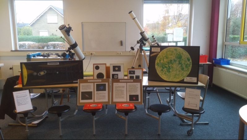 Op donderdag 29 november 2018 waren wij uitgenodigd voor een gastles/voordracht op deze gezellige dorps-basisschool. Het was een wat regenachtige dag, dus alle activiteiten moesten ook binnen plaatsvinden. Wij waren weer zeer verrast, want wat bleek: de leerkracht had samen met de aanwezige leerlingen (groep 8) al ruim van te voren veel aandacht aan diverse sterrenkundige onderwerpen gegeven. Dus als afsluiter waren wij er, en het meegebrachte materiaal incl. 2 telescopen trokken dan ook veel belangstelling!