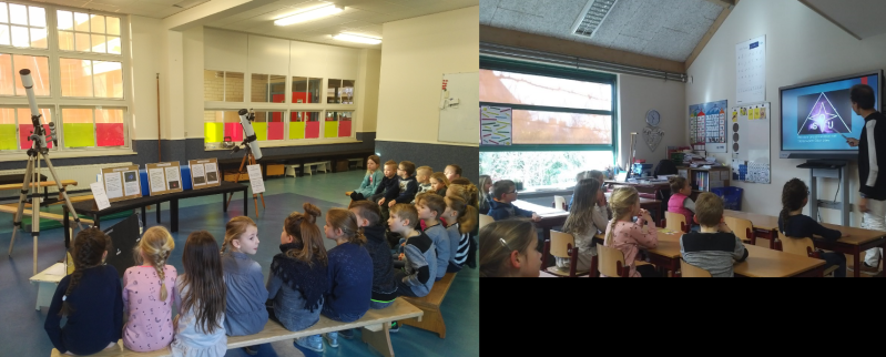 Na aankomst op 2maart gingen wij om 09:15u van start, en we begonnen meteen in de gymzaal van de school, waar wij al een kleine presentatie hadden opgebouwd. Thema: Het zonnestelsel en afstanden binnen het zonnestelsel, en uitleg over verschillende telescooptypen. We hebben de leerkracht en een viertal leerlingen kaarten omgehangen met de afbeeldingen van de Zon en de planeten Mercurius t/m Mars, en weggezet waarbij de afstanden en afmetingen precies op schaal waren. Men verwonderde zich hoe ver toch alles van elkaar af stond! Wat ons het meest verwonderde was wel het feit dat zulke jonge kinderen (groep 3 en 4) er al zoveel van wisten. Het bleek dat deze school het er structureel in heeft zitten, lessen over ruimtevaart en sterrenkunde afgestemd op deze leeftijdsgroep. Waar vind je zoiets nou nog?? Een van de leerlingen in deze groep bleek ook nog eens met zijn ouders bij ons op de sterrenwacht op bezoek te zijn geweest tijdens de Nationale Sterrenkijkdagen!