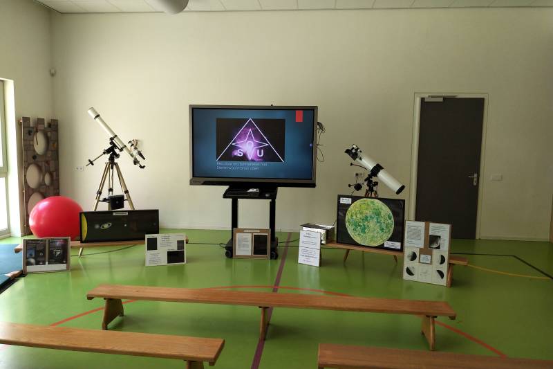Beide groepen hadden in de klas met hun leerkrachten al het e.e.a. over het heelal behandeld, dus daar konden wij mooi op voortborduren. Na afloop werden er dan ook goede vragen gesteld, maar helaas doordat wij te weinig tijd (hooguit 45 min.) kregen om ook een interessante buitenactiviteit te ontplooien, moesten we het doen met enkel het binnenprogramma. We vulden dat aan met een duidelijke uitleg over de twee meegebrachte telescooptypes; de 6,8cm lenzentelescoop en de 11,5 cm Newton spiegelkijker, en hoe je op een veilige manier de Zon kan waarnemen.